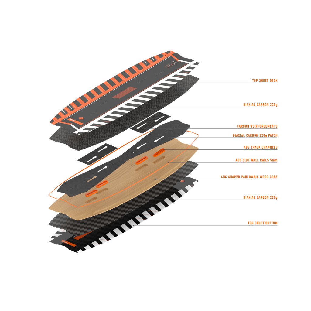 The squared/swallow tips provide more surface area for grip and increased pop. This tip shape creates a higher angle of attack on the water surface making it easier to hold in over-powered conditions, making the Poison V6 the ultimate weapon for big air. This version has a carbon reinforced track system that, in combination with our Rad Pads or boots, enable the rider to make the smallest adjustments needed to perfect their stance for maximum performance.