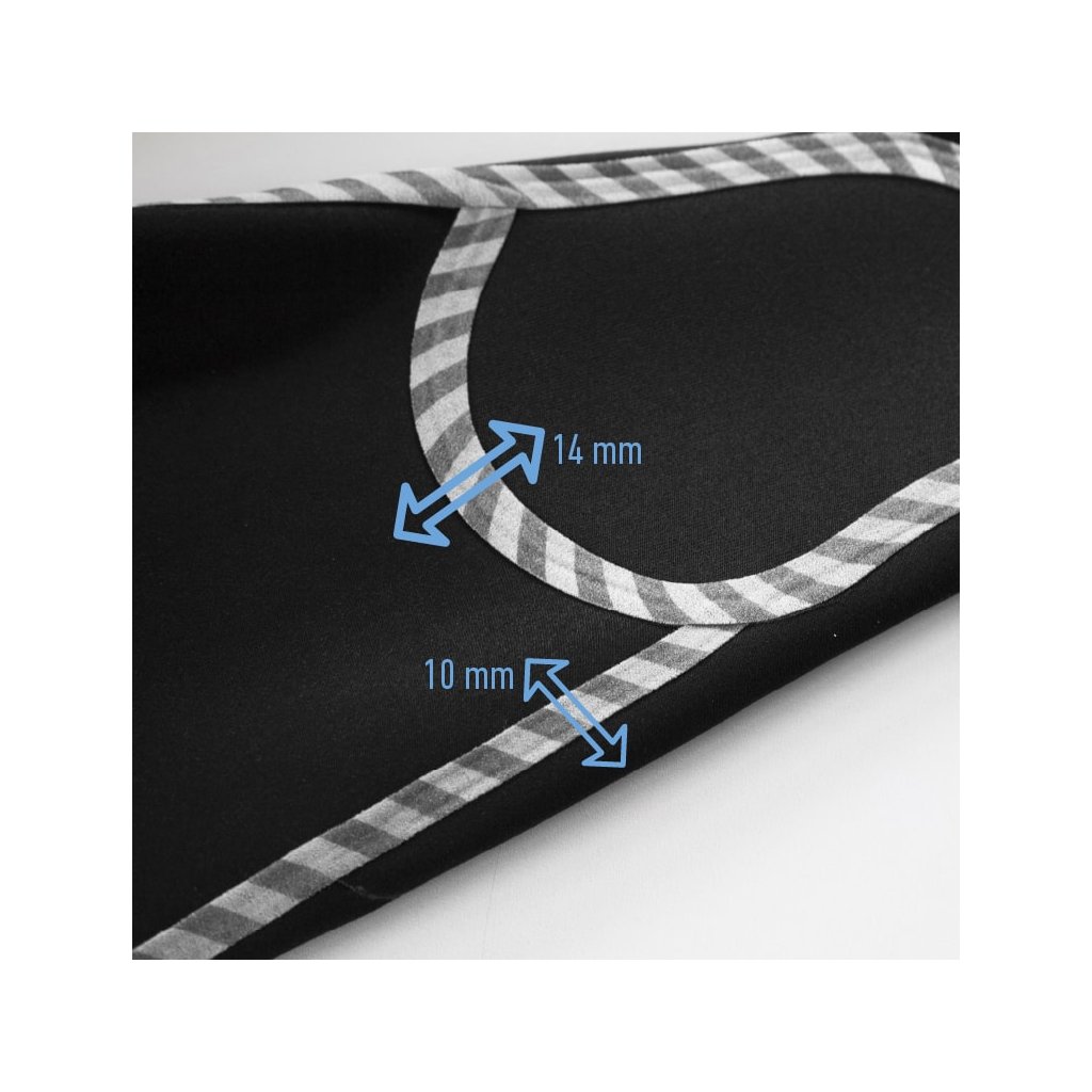 Some areas are very sensitive to friction, tension and tearing that’s why we used two different tape width, 14 mm for crotch HI-stressed area and 10 mm for the rest of the panels. This intelligent positioning of materials allows saving weight and keeping the right elasticity and strength.