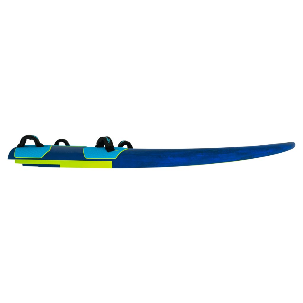 The incredible thickness from the tail to the forward strap area increases the volume and offers clearly more leverage. Powerful foils and sails can be handled easily.