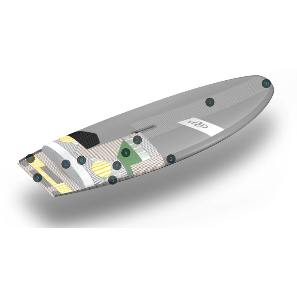 It features sustainable materials like the fast-growing Paulownia wood (7) for reinforcements in the bottom and a PET-recycled high-density sandwich (4) reinforcement in the deck.