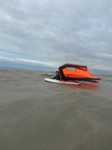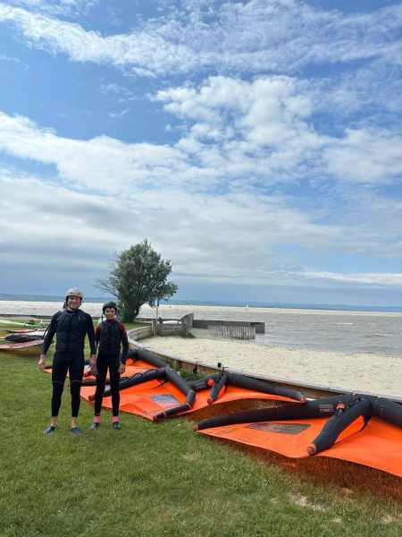 První den foukalo více než 10m/s a naši kurzanťáci se museli poprat nejen se silným větrem, ale také s velkými vlnami vyvolanými tímto větrem. Překonali náročné podmínky a někteří z nich dokonce zažili pocity první levitace. Po náročném dni jsme se všichni sešli u hromadné večeře, kde jsme si mohli parádně popovídat a sdílet zážitky z celého dne. Druhý den se počasí uklidnilo, vítr zeslábl a ustálil se. To byla skvělá příležitost pro méně zkušené i pokročilé jezdce, kteří si mohli vyzkoušet stoupání, otočky a pumpování ve slabším větru![]()