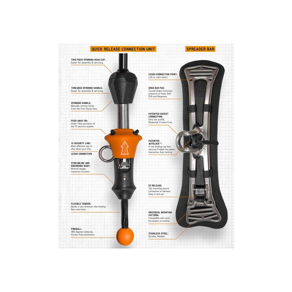 Fireball’s ball and socket interface is a semicircular fitting that brings the pivot point of the connection extremely close to your body. Fireball’s intelligent low profile design keeps the spreader bar from rotating into your body when the pull of the kite comes from overhead.