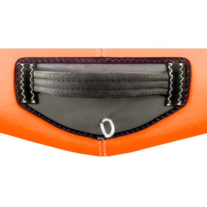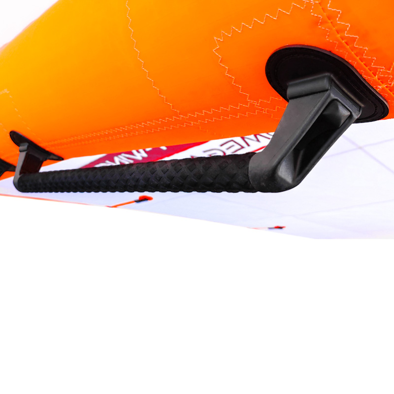 Pevná měkká rukojeť umístěná na náběžné hraně umožňuje neutrální tah křídla za sebou, což je ideální pro jízdu na vlnách nebo snadný přenos. Pod rukojetí se nachází měkká podložka, která chrání klouby před nárazy. Bílé poutko je určeno pro připevnění vodítka.