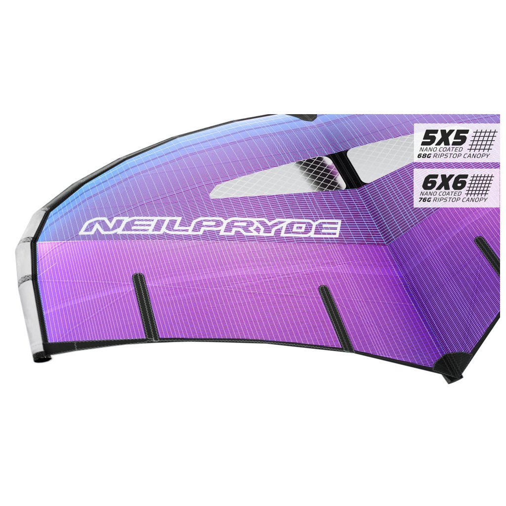 Stupňované Ripstop panely (5×5 vpředu, 6×6 vzadu) drží optimální poměr váha–pevnost. Díky příčnému panelingu si wing zachovává tvar i pod velkým zatížením a nedeformuje se v čase.