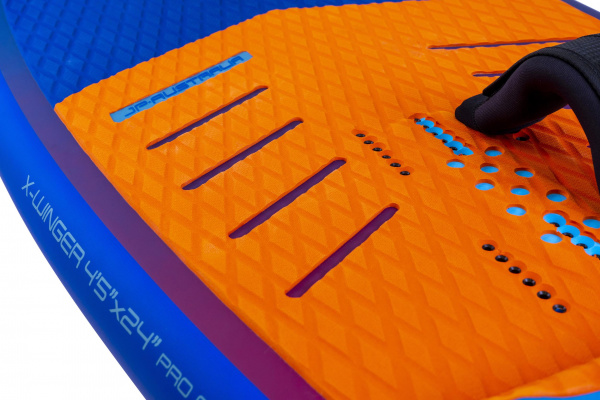 The X-Foil is a true all-rounder shining in all foil disciplines: wing foiling, SUP foiling and windsurf foiling! Shorter in length, wider and thicker compared to the WAVE SLATE or previous year’s FOIL range, the boards offer generous flotation for instant reaction to pumping and for easy take off. The concave deck shape makes it easy to locate the center of the board and to find a good balance over the foil. The bevelled rails and tail kick help with reducing the wetted surface for easy take off and carefree tight turns. Riding strapless is the best decision when you are a total foil beginner or only just get used to foiling. Once advanced, various foot-strap positions cover all needs: depending on your individual preference the V-angled or the centered footstrap position are ideal for wing foiling, SUP foiling and strapped tow foiling.