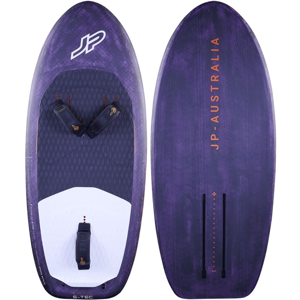 JP F-Winger S-TEC — Lean, Mean, Freestyle Machine! Tři velikosti: 55 l (137×56 cm, 4,6 kg), 66 l (140×58 cm, 5,0 kg), 77 l (145×61 cm, 5,3 kg). S-TEC konstrukce: EPS core + PVC sandwich + biax carbon + Innegra raily. Pulled-in nos, compact shape, new absorber pady, 2× Long US Track box. Cca 700 g lehčí než předchůdce. Plate Nuts included. Doporučeno s NP Glide Surf foilem a NP FireFLY Pro wingem.