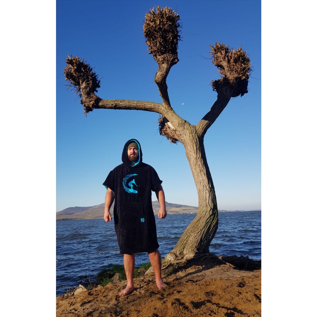 Univerzální Pončo je ideální pomocník u vody, ale dokážete ho využít i doma po sprše nebo jen tak u TV.  Na přední straně je výrazná modrá výšivka a malé logo RDB. Kapuce má praktické tkaničky, které využijete hlavně při větrném počasí a do velké přední kapsy schováte cokoliv.