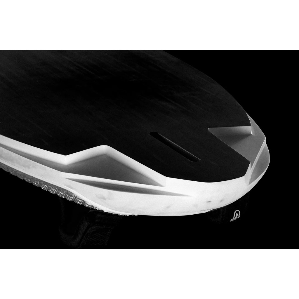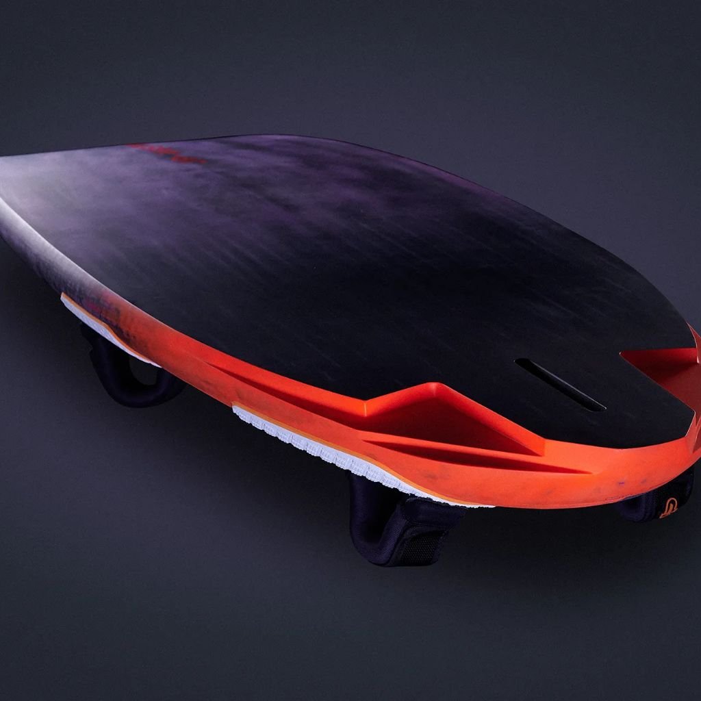 Paralelní linie u stěžňové patky maximalizuje plánující plochu — deska ihned na plánu. High apex rail shape generuje vztlak pro brzké plánování, akceleraci a stabilitu v gybech. Štíhlý nos profil, aerodynamická paluba, recess u deck boxu snižuje pivot point rigu.