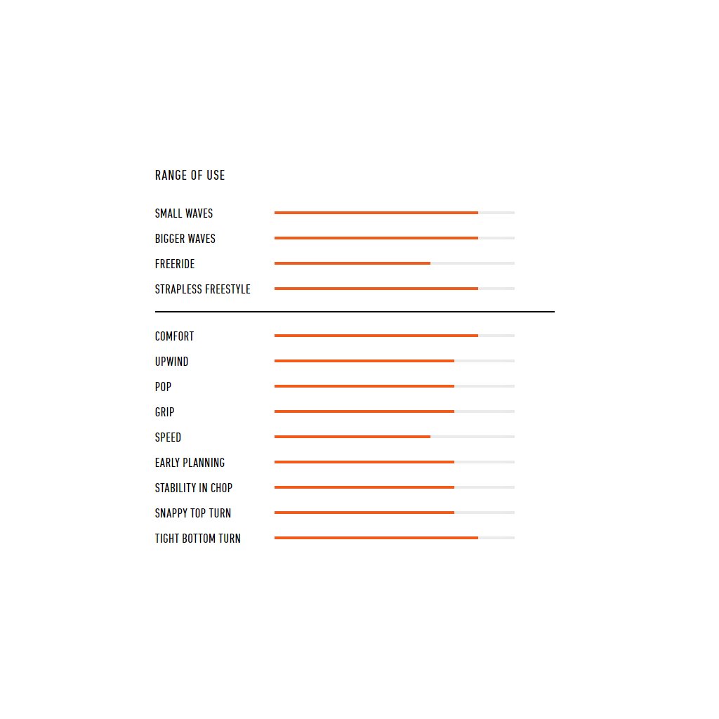 The C.O.T.A.N. shape will allow you to feel exceptionally free and fast in everything you do, whether you are hitting medium size waves or having fun with freestyle tricks, the compact shape of the C.O.T.A.N. is perfect to lead you through your freestyle strapless progression. Since last year the tail shape it’s been redesigned with wingers and rounded fishtail ends, allowing more aggressive turns at high speeds, when riding waves, or when pushing to get the maximum pop. |