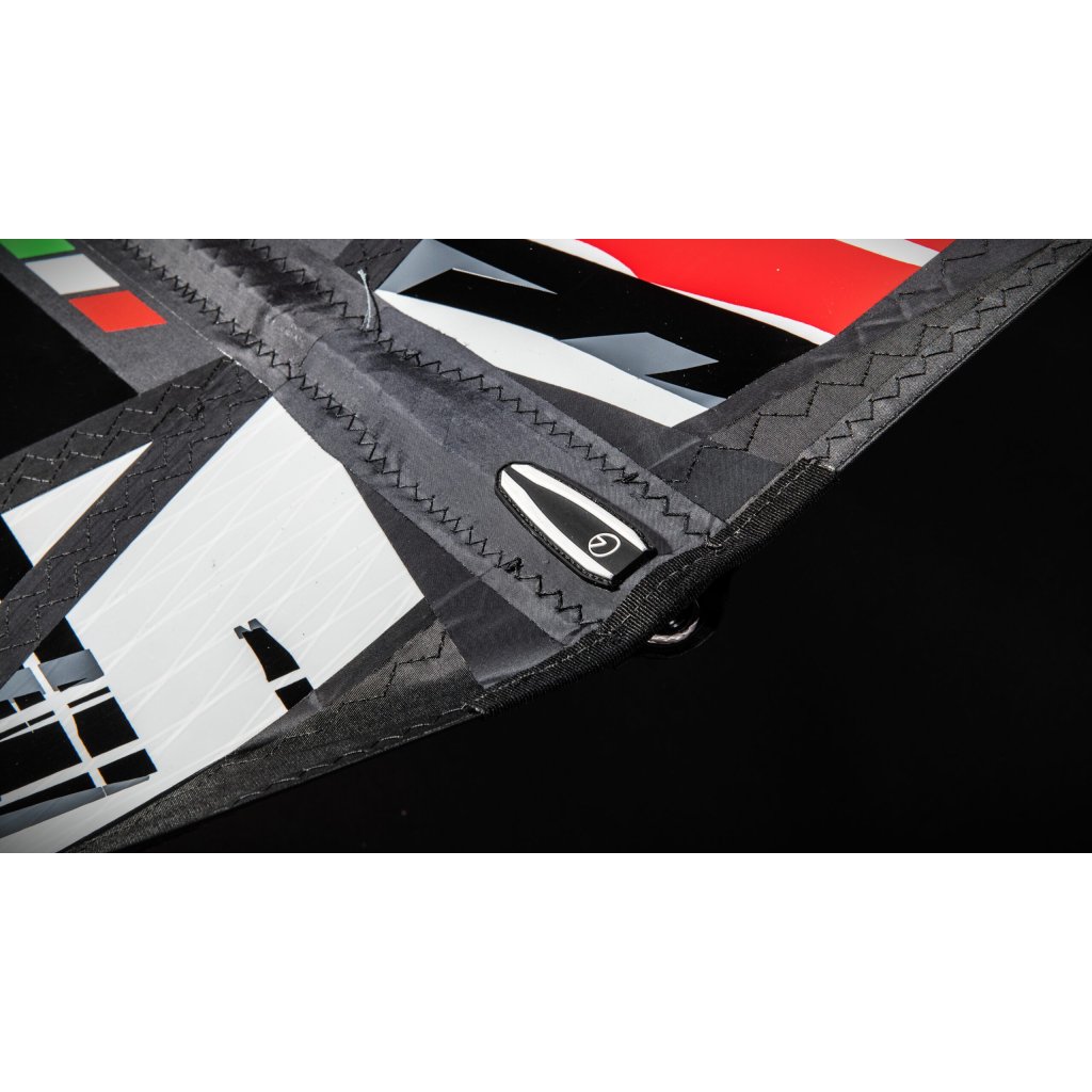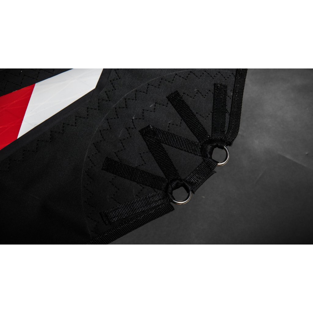 Závětrná strana plachty nese hlavní tah – hluboký, kompaktní draft těsně nad ráhnem vytváří sílu pro razantní spodní oblouk. Dacronový luff panel funguje jako ventil: pod tlakem drží profil pevný a stabilní, ale jakmile plachtu odlehčíte na vlně, panel se uvolní a plachta přestane táhnout. Q-Bond konstrukce tento efekt zesiluje – bez švů je přechod mezi tahem a uvolněním ještě ostřejší a přímější. X-Ply panel za dacronem přenáší každý pohyb do prkna bez jakékoli prodlevy.