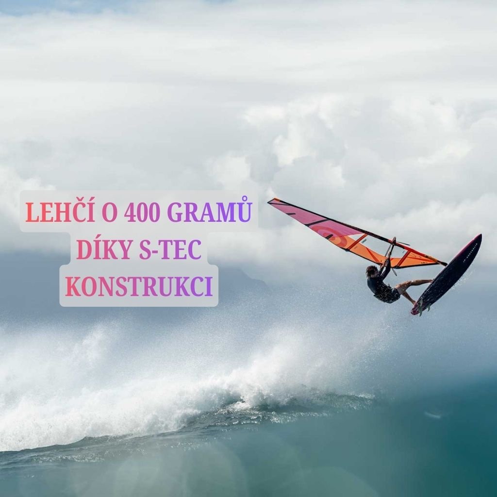 S-TEC konstrukce dosahuje úspory váhy odstraněním laku, menšími EVA pady a eliminací zadního středového fin boxu. Odolnost zůstává na vysoké úrovni díky S-glass, Biax-Carbon výztuhám a UD Carbon vrstvám. Spodní laminát obepíná rail — funguje jako dodatečný stringer.