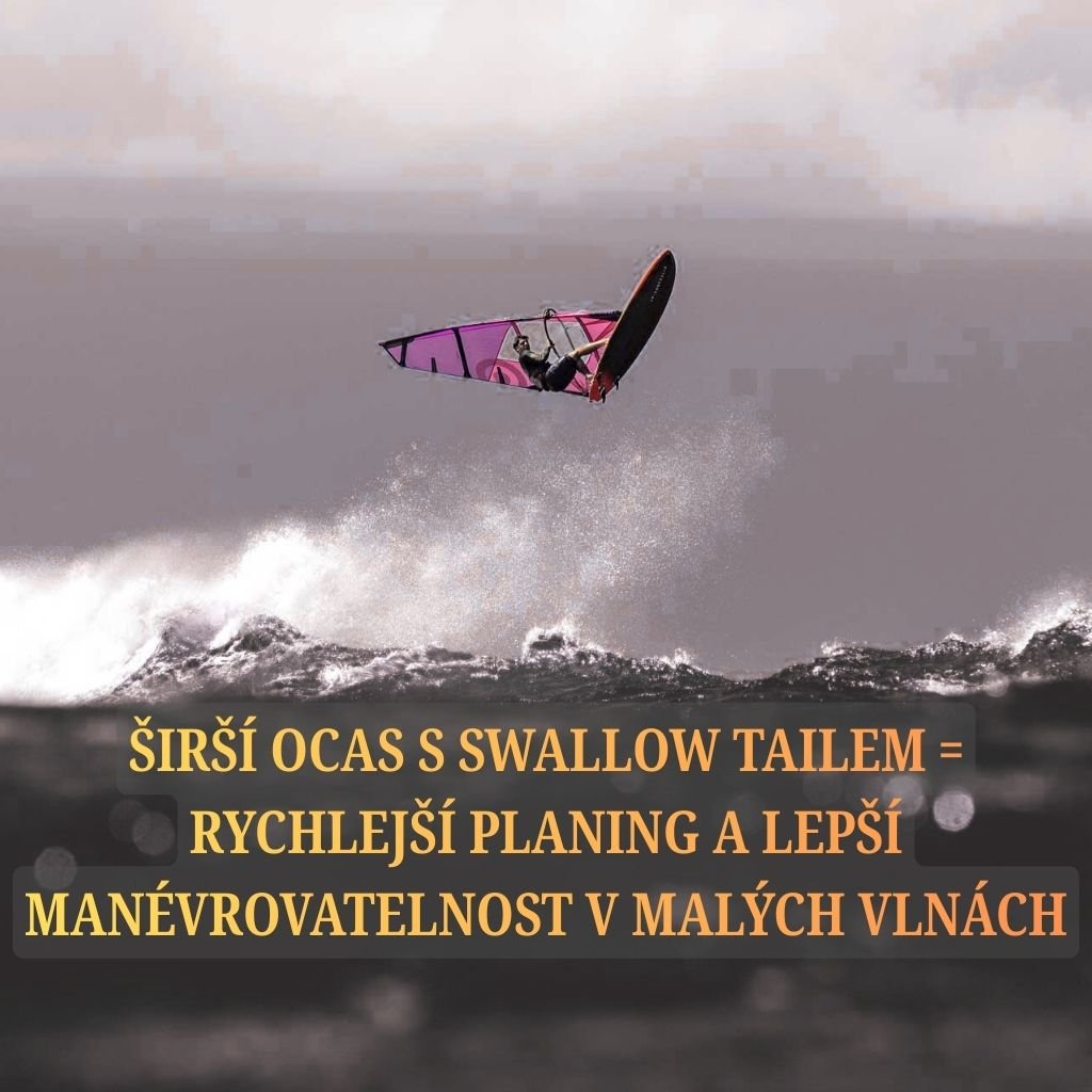 Širší ocas s swallow tailem = rychlejší planing a lepší manévrovatelnost v malých vlnách. Užší nos přidává přesnost bez ztráty stability.