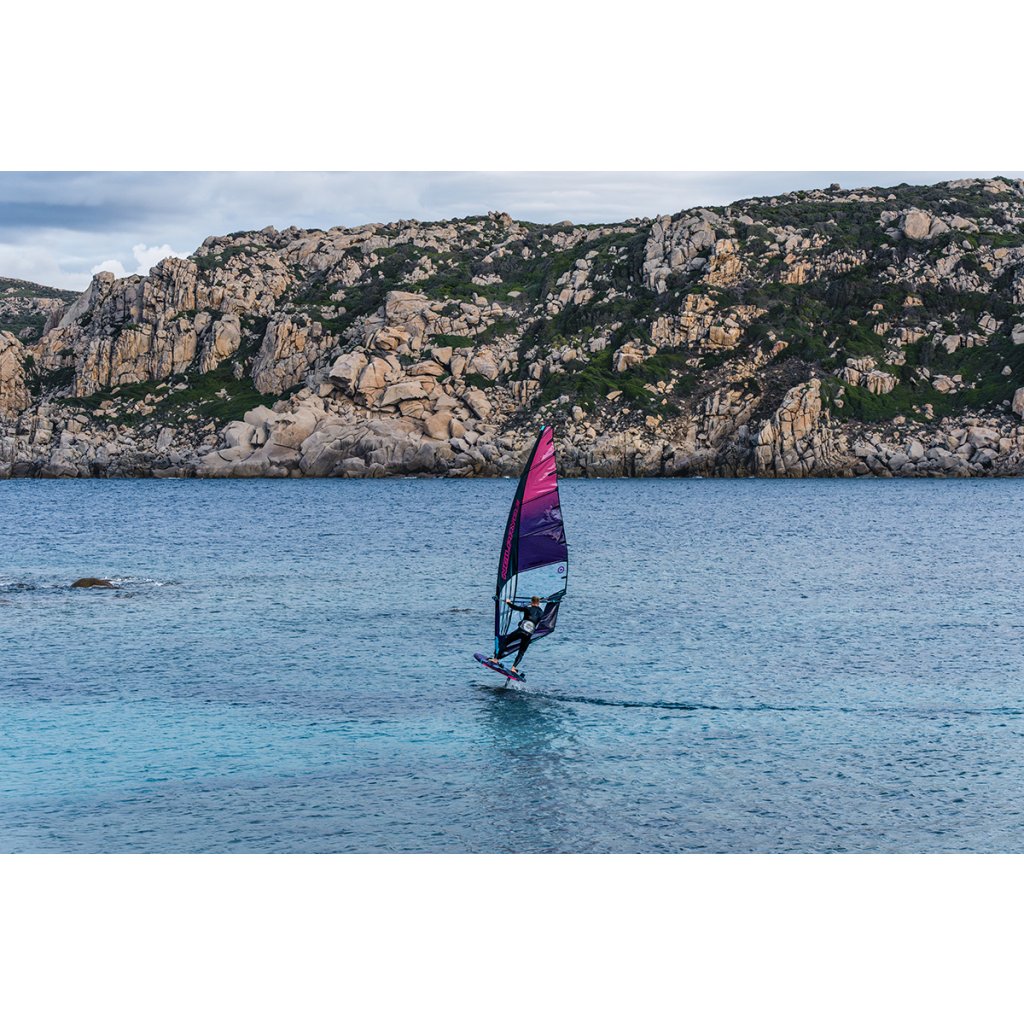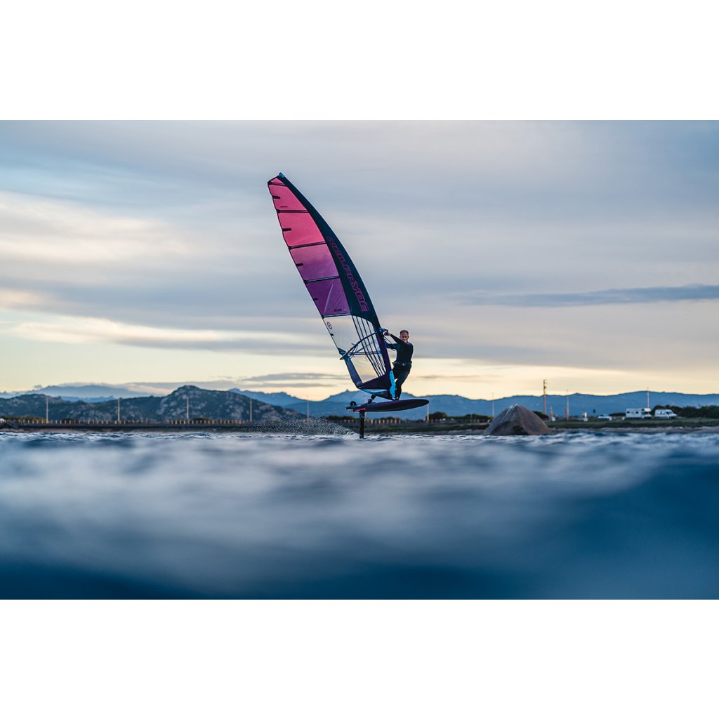 Building on the success of our 2023 Flight EVO IV, our most technologically advanced foil sail has been redesigned once more to cater for the insatiable demands of our top foil racers. The entire sail is modeled in 3D in its actual flying shape with twist and luff curve accounted for. Quadruple luff panels blend with full carbon battens above the boom for ultimate performance. Higher aspect ratio with increased release in mid leech improve acceleration and cross - wind performance.
